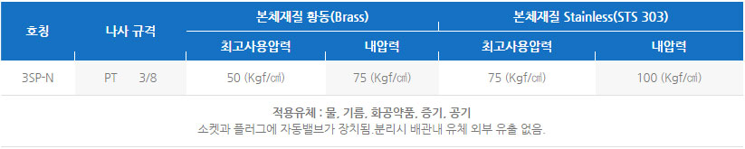 - 본체 재질은 황동(Brass) 과 스테인레스(Stainless STS303)를 생산하고 있습니다.